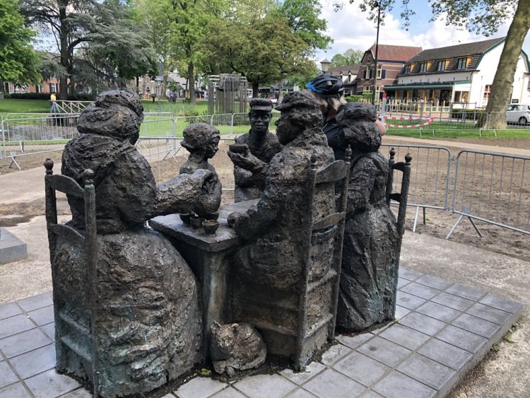 Twee maanden later gaan we van start in Oost-Brabant, waar we de auto bij familie kunnen laten staan. Ons lunchpakket wordt aangesproken in Nuenen, waar ooit Vincent van Gogh woonde en de boeren uit de streek portretteerde. ‘De aardappeleters’ zijn zelfs levensgroot in 3D te bewonderen in het parkje in het centrum. We fietsen dwars door Eindhoven, over de campus van de Technische Universiteit. Op weg naar de grens komen we door Eersel met een mooi plein waar veel fietsers even aanleggen voor een versnapering. Wij gaan ook zitten voor een kopje koffie, even van het zadel af. Het is er een drukte van belang, fijn om te zitten en mensen te kijken. Daarna fietsen we weer verder, tot net over de grens in Retie.