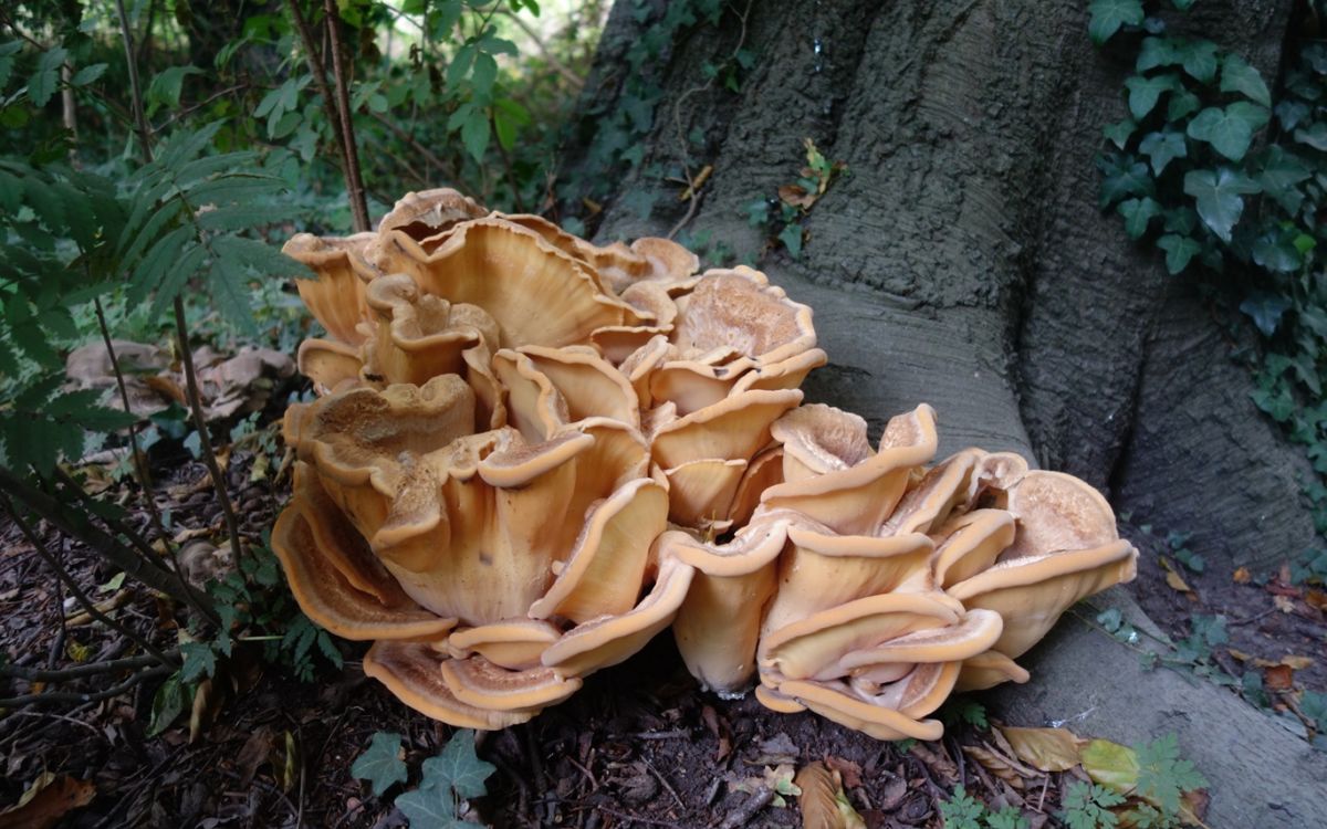 We lopen vanaf het station al snel buiten de bebouwde kom en lekker rustig buiten het bereik van auto’s. Wel is er hier en daar een maïsveld en dat houdt het uitzicht in deze tijd van het jaar wel eens tegen. Nu ja, even wachten en de maïs is weer van het veld af. We worden verrast door een zwavelzwam met een doorsnede van meer dan 30 cm aan de voet van een eik. Het lijkt bijna op een bos rozen. Die zal nog wel een tijdje standhouden, dus hopelijk kunnen er nog veel wandelaars van genieten – al is de prachtige zalmkleur van het begin dan wel weg.