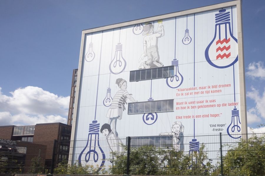 We zien rechts nog een enorme muurschildering met klimmende kinderen en gloeilampen op de achterkant van het kantoorpand Donna. Het is een creatie van illustrator Geert Retera. De tekst is van rapper Frescu.
