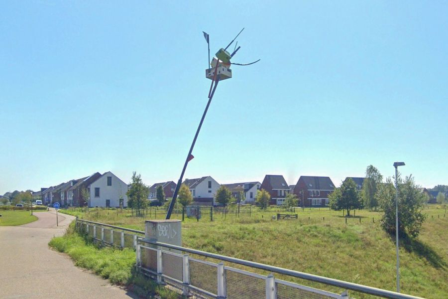 Wat zien we nou ineens aan de rechterkant vlak voor we de bebouwde kom van Best inrijden? Een wel erg scheve lantaarnpaal met speelgoedhuisjes in de top lijkt het wel. Dat moet wel een kunstwerk zijn. Dat is het ook, het heet De Spriet en is gemaakt door Auke de Vries. Op de website van de gemeente Best staat het zo verwoord: “ De Spriet maakt zich los van de aarde en wekt de illusie dat hij een reis door de lucht maakt, de ruimte boven het dorp waarin je kan omzwerven. Dat is het domein van wind en snel veranderende luchten”. Kortom: het beeld moet je fantasie aanwakkeren.