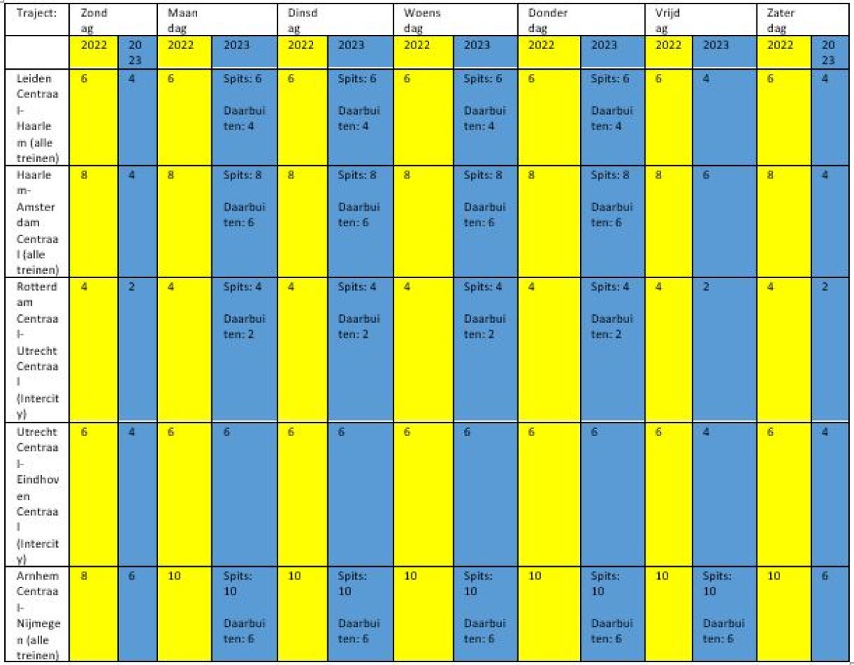 Een aantal trajecten moet het in 2023 in de spits met minder Sprinters doen. In de meeste gevallen gaat het aantal treinen terug van 4 naar 2 per uur, soms van 6 naar 4. In het kader staat een overzicht van de trajecten die hiermee te maken krijgen. De meeste van deze veranderingen zijn overigens in de loop van 2022 al ingevoerd.