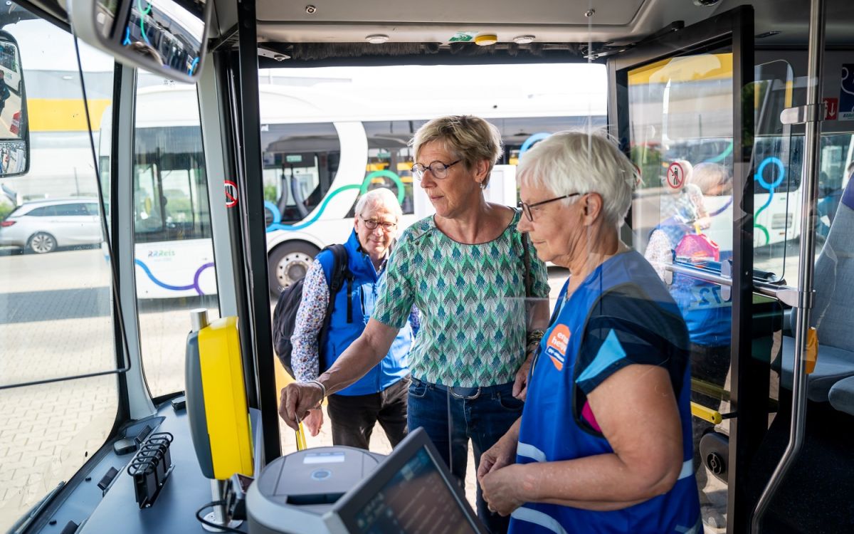 Een OV-ambassadeur helpt bij het inchecken in de bus