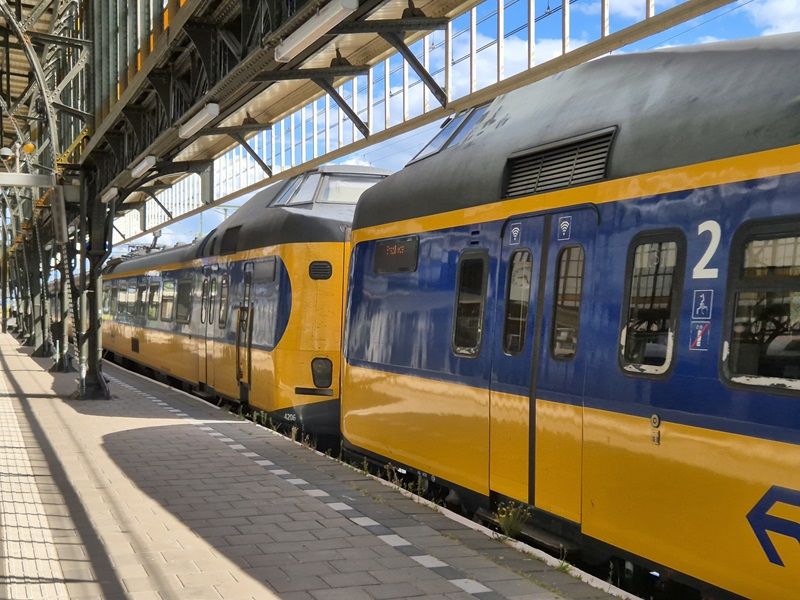 Mijn vrouw en ik gingen op vakantie met fiets en trein. Trein naar Hengelo, dan een week toeren langs drie hotels en terug naar huis. We startten op station Gouda: twee stadsfietsen, twee stuurtassen, twee rugzakken, twee keuzedagen en twee fietskaartjes. De trein bestond uit twee ICM-stellen (‘koplopers’) van elk drie treindelen, met in elk treinstel drie fietsplekken. Lastig: in het treinstel van onze keuze stonden al twee racefietsen op de fietsplekken, maar die hoefden niet verder mee dan Utrecht. Daar konden wij er nog één kwijt, en voor de andere vonden we een plaats in het gangetje naar de machinistencabine. Die machinist was daar toch niet, want we zaten aan het eind waar de twee treindelen aan elkaar gekoppeld waren. Prima geregeld. Wij zochten stoelen met zicht op het balkon.