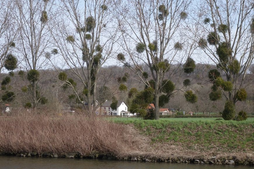 Bij Voulwames komen we weer in de enigszins bewoonde wereld, en bij het Julianakanaal. Dit kanaal ligt er sinds ongeveer 1930, en heeft bijna een eiland gemaakt van de omgeving waar we doorheen kwamen. Links de Maas, rechts het kanaal. Ach ja, de Maas met al die bochten, dat schiet niet op voor de scheepvaart, dus dan graaf je een kanaal. De populieren langs het kanaal zitten vol maretakken. Drie km langs het kanaal lopen is wat saai, dus we gaan ook weer naar de Maas en passeren het dorp Geulle, met mooie kerk en idem kasteel. Maar wat is dat met die tientallen meters lange oranje strip, ingegraven langs de weg bij het kasteel? Wacht, aan het eind is ook een emmer in de grond ingegraven. Dus de strip is bedoeld om padden tegen te houden, die vervolgens in de emmer moeten vallen, en dan veilig naar de overkant gebracht kunnen worden. De emmer is blijkbaar pas geleegd – geen pad te zien.