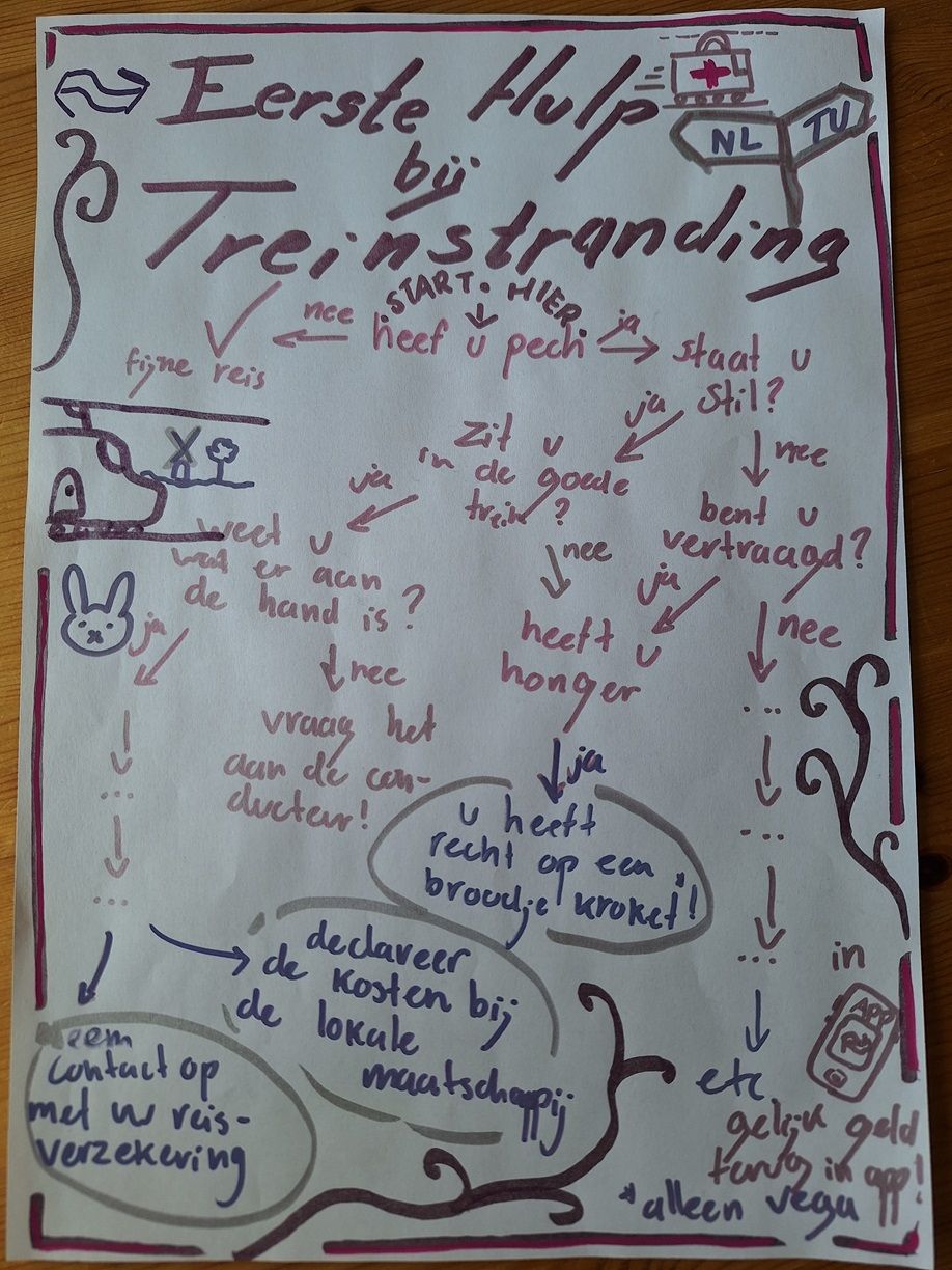 Tijdens het symposium hebben de studenten daarom actief meegedacht over verbetervoorstellen. Zo werd bijvoorbeeld geopperd om een QR-code op de achterkant van treinstoelen te zetten, die direct de webpagina opent over compensatie bij vertraging. Ook een beslisboom om te ontdekken wat je rechten zijn werd genoemd als een handig middel.