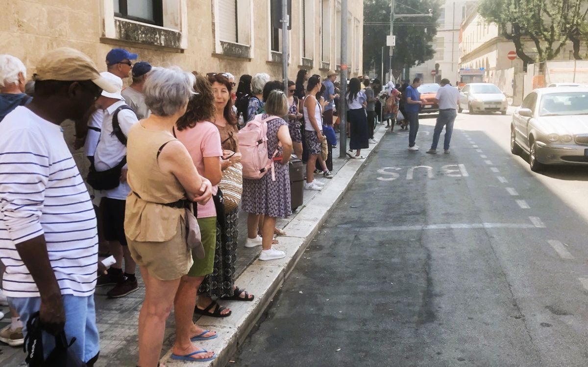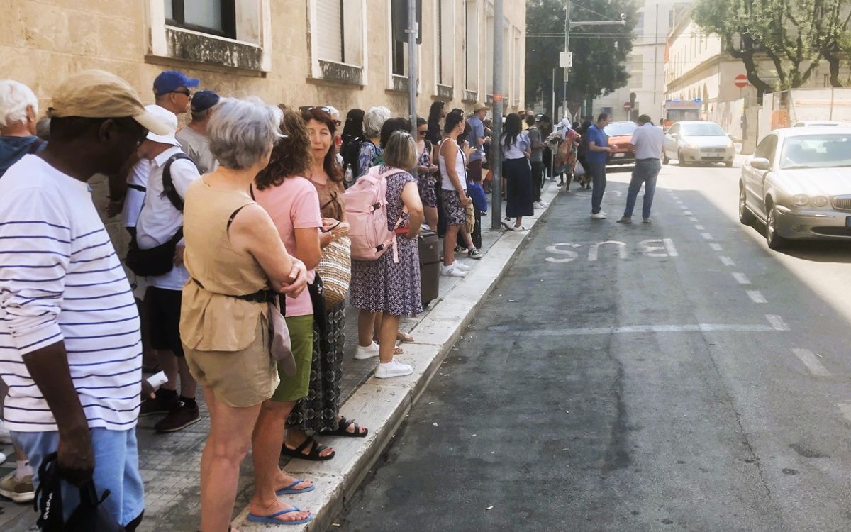 De volgende dag gingen we naar Otranto, waar onze achtdaagse trekking over kustpaden begon. Er is tijdelijk treinvervangend busvervoer, want de spoorlijn en de stations op het traject naar Otranto worden vernieuwd, inclusief elektrificatie. Drie busregelaars zorgen er vooral voor dat de bushalte niet als parkeerplaats wordt gebruikt. De bus komt op tijd de hoek om, maar kan de halte niet bereiken omdat een ambulance de weg blokkeert. Na veel gepraat en drukke handgebaren blijkt de ambulance toch een beetje opzij gezet te kunnen worden, zodat de bus erlangs kan.