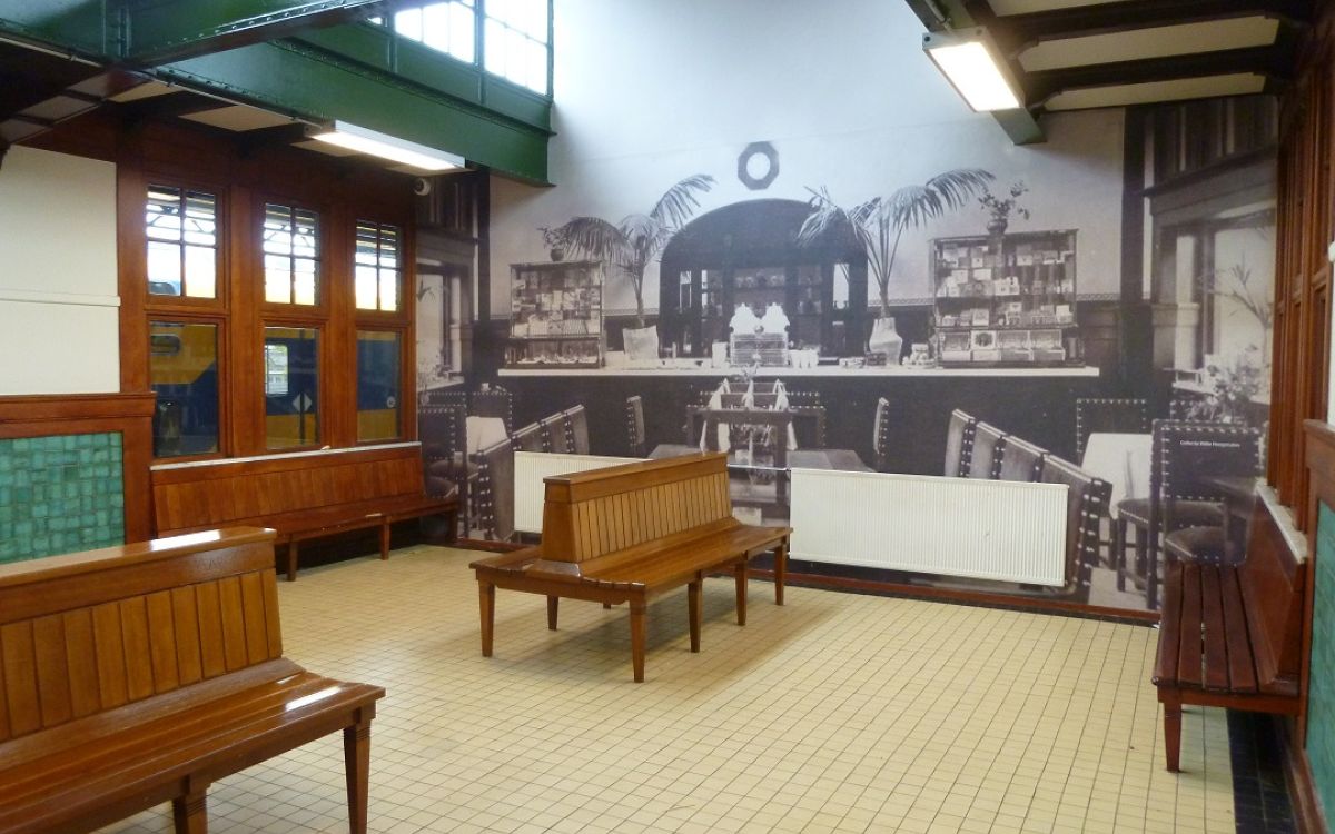 De voormalige wachtkamer 1e en 2e klasse is afgesloten. Vanuit de halletjes bij de toiletten kun je zien dat de wanden zijn gepleisterd, maar dat de stalen balken nog details dragen van historische versieringen. De wachtkamer 3e klasse is nog gedeeltelijk in gebruik. Mooie tegeltableaus en houten banken zijn er te bewonderen. En het wachtlokaal is verwarmd; ook iets om blij mee te zijn wanneer de temperaturen dalen en je je trein gemist hebt.
