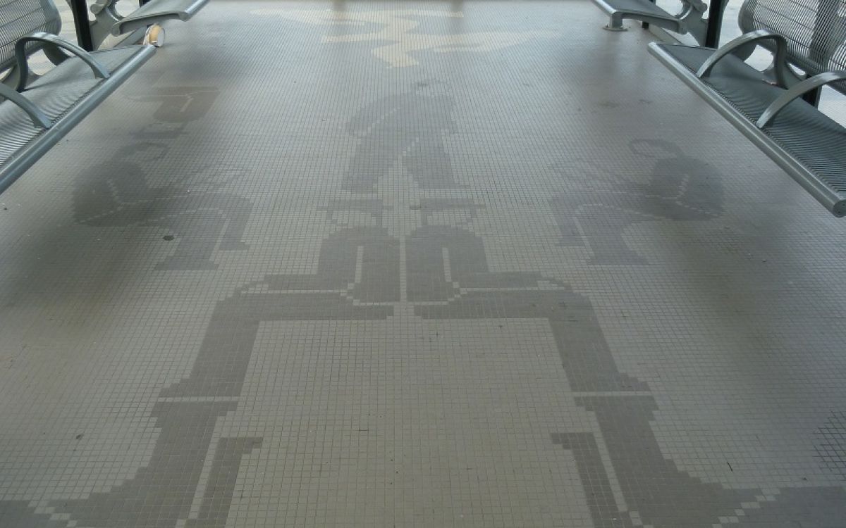 In de wachtruimte en op het perron zijn Arntz’ symbolen vertaald naar een mozaïek en een reliëf. In verschillende relaties tot elkaar gezet verbeelden zij samen het groepsportret ‘De Reiziger’.