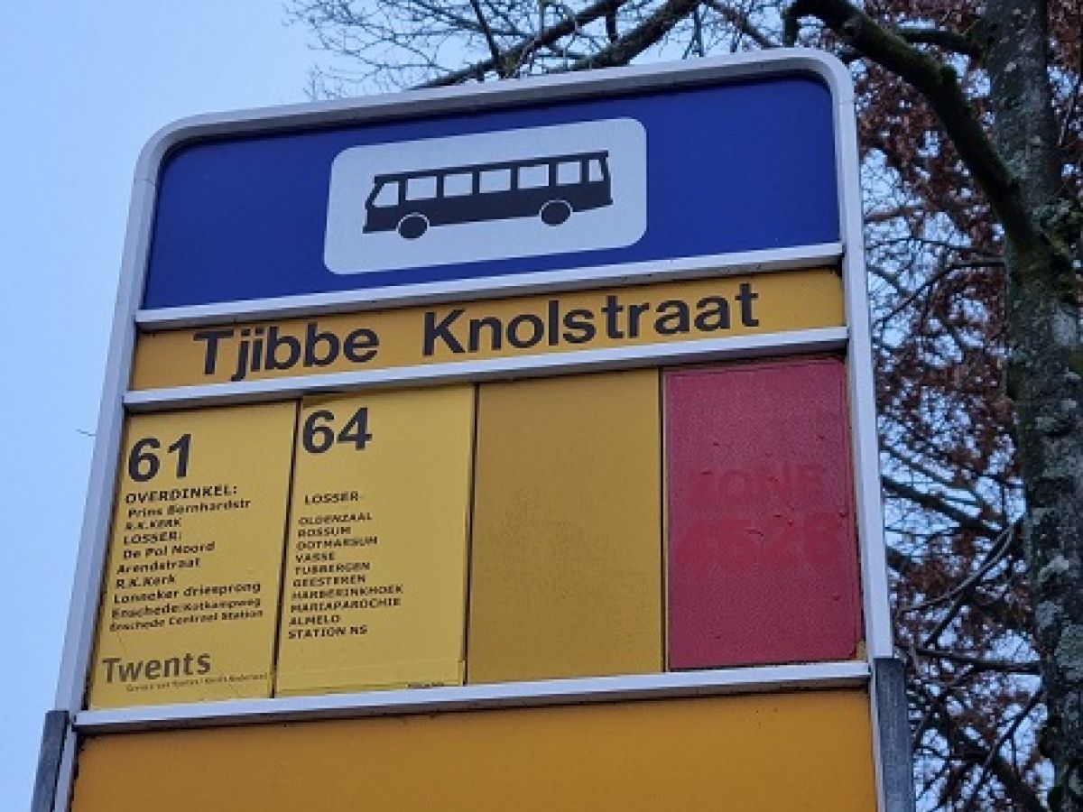 Wie in 2024 bij de halte Tjibbe Knolstraat wil instappen, zal merken dat er wat is veranderd. Twents van Syntus heeft plaatsgemaakt voor RRReis van Arriva. En lijn 64 stopt er niet meer. Naar Oldenzaal moet je nu met lijn 66. Die rijdt ook naar Almelo, maar via Weerselo in plaats van via Ootmarsum. Naar Enschede kan nog steeds met lijn 61. Wie weet ontdekt u ergens tussen Losser en Enschede wel de zes verloren aandelen van Tjibbe Knol!