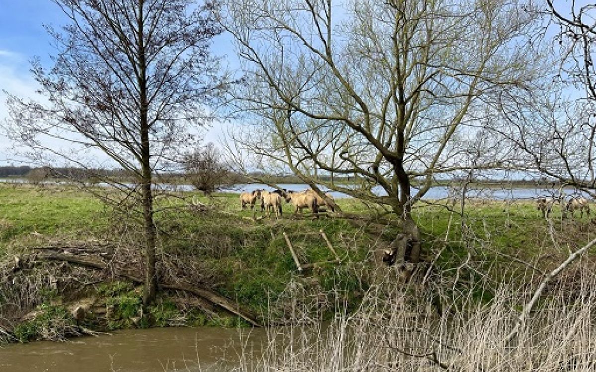 Konikpaarden grazen in de uiterwaarden van de Maas. Op de voorgrond de Geul, op de achtergrond de Maas