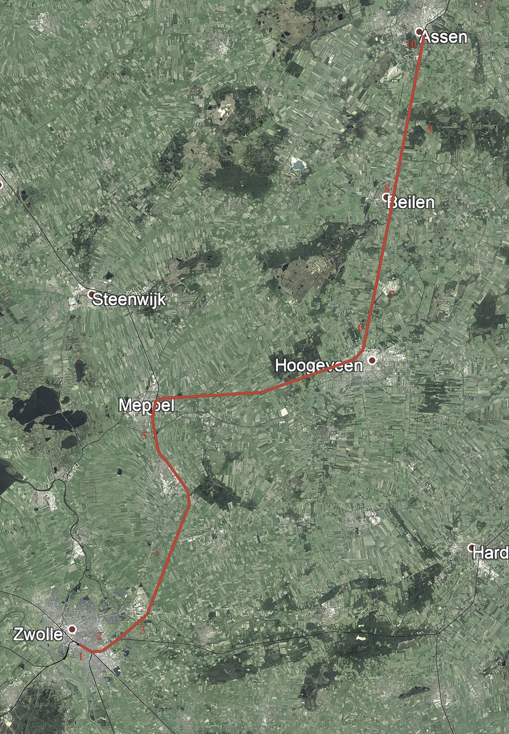 25,5: vlak voor station Meppel gaan we over de A28 (de snelweg naar Groningen) en de A32 (de snelweg naar Leeuwarden) met daartussen de Hoogeveense vaart, die zoals de naam al doet vermoeden naar Hoogeveen leidt, maar ook nog verder gaat naar Emmen.