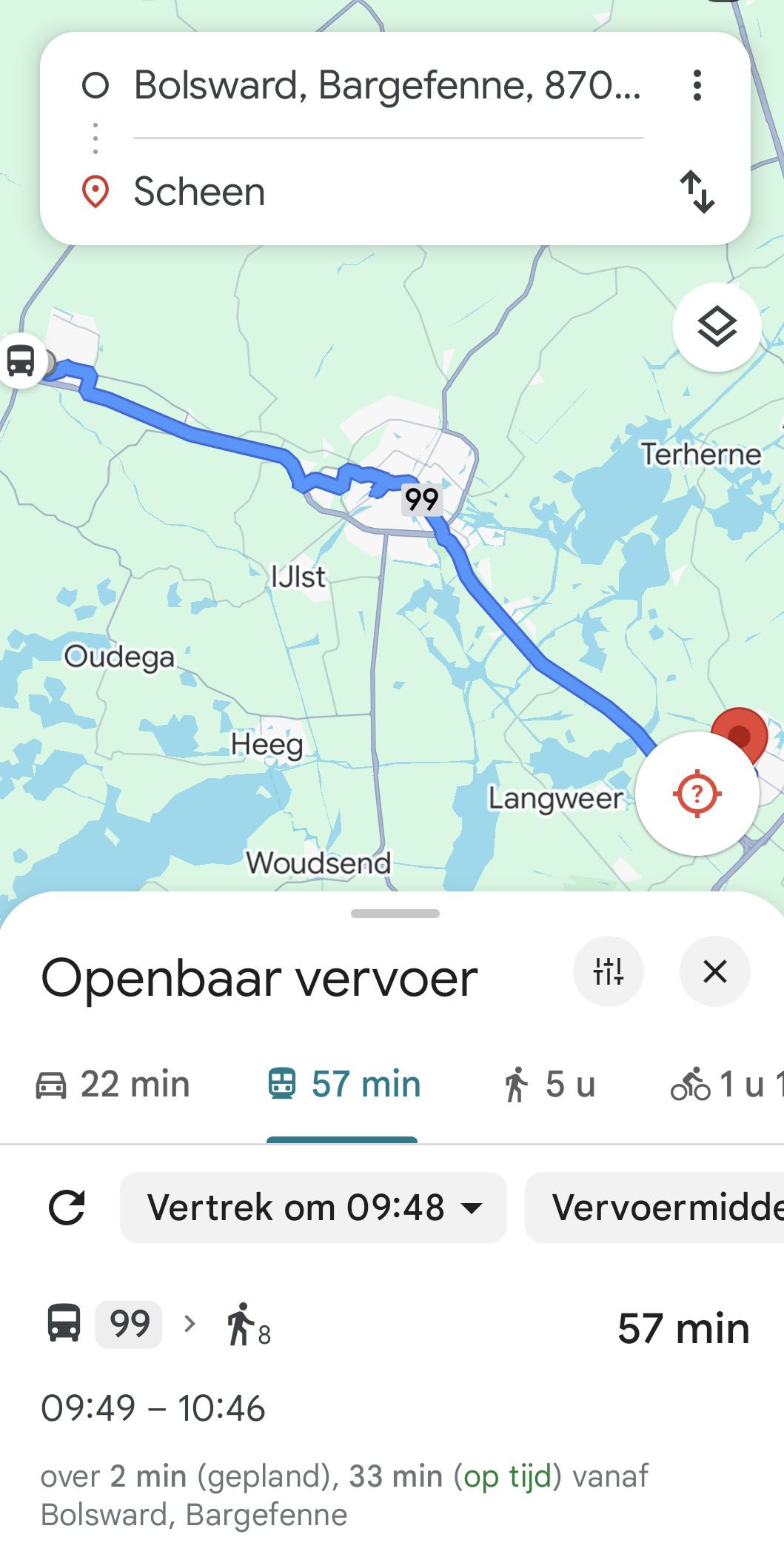 Bij de halte staat dat je bus 2 minuten vertraging heeft; maar volgens de reisplanner is het 5 minuten.