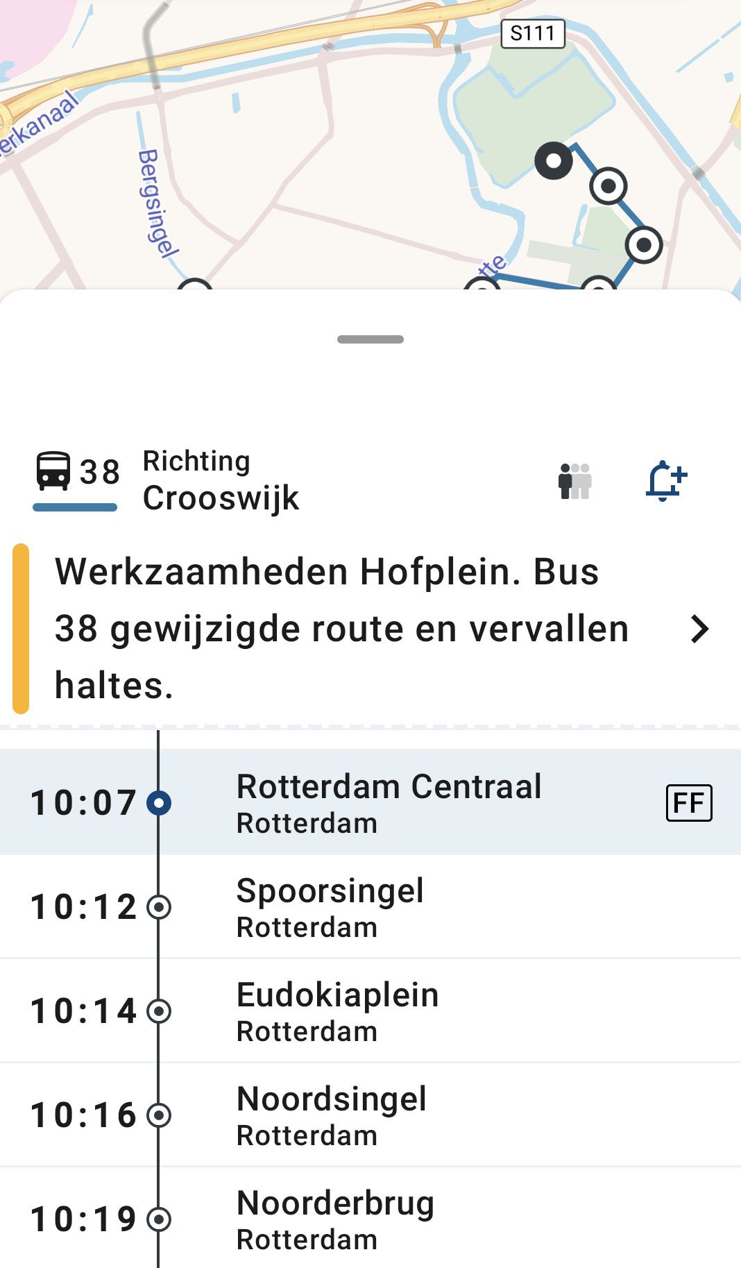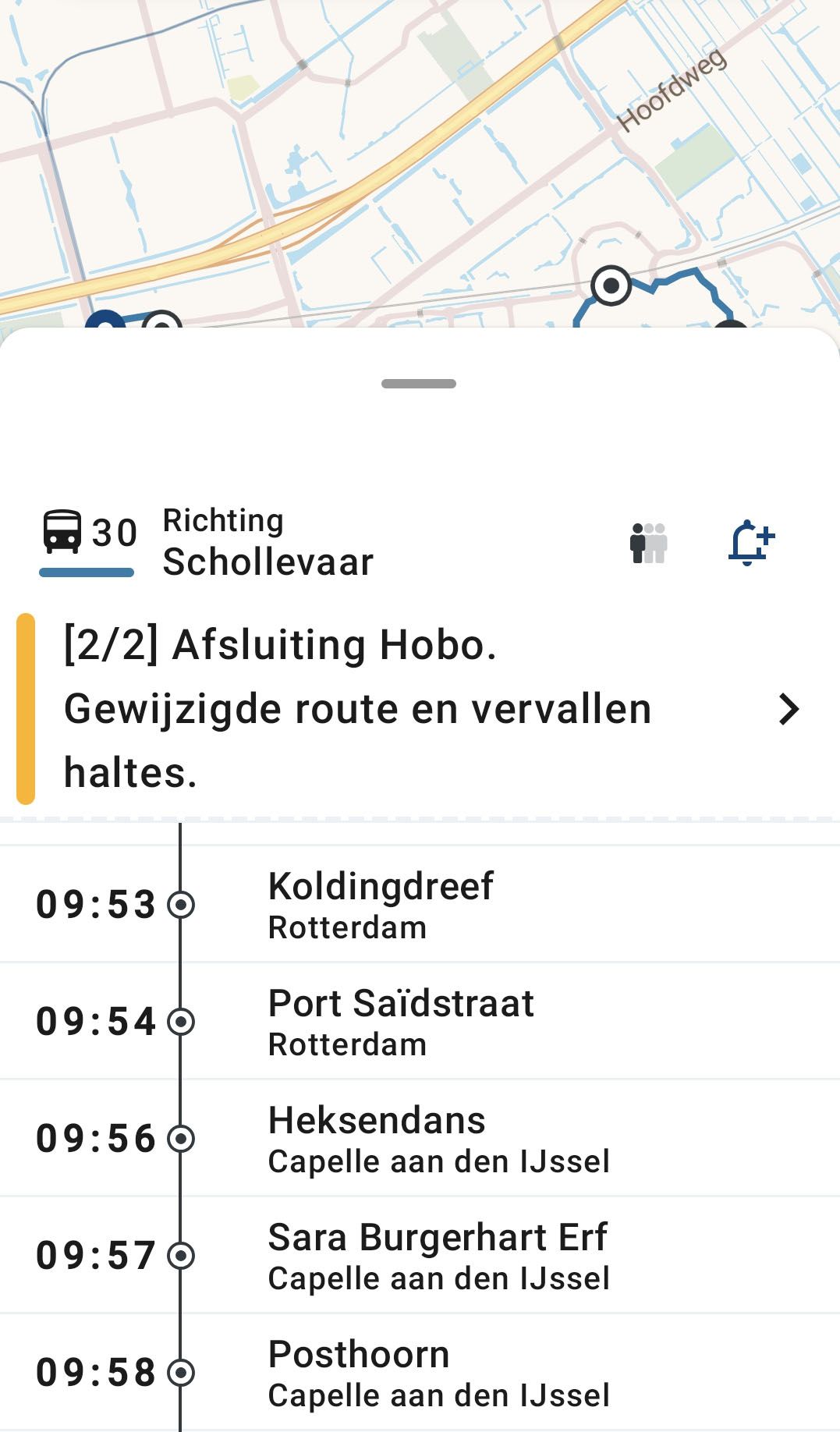Op de halte staat een bericht dat bussen niet rijden wegens een verstoring, maar daarboven staat gewoon dat jouw bus over 2 minuten vertrekt.