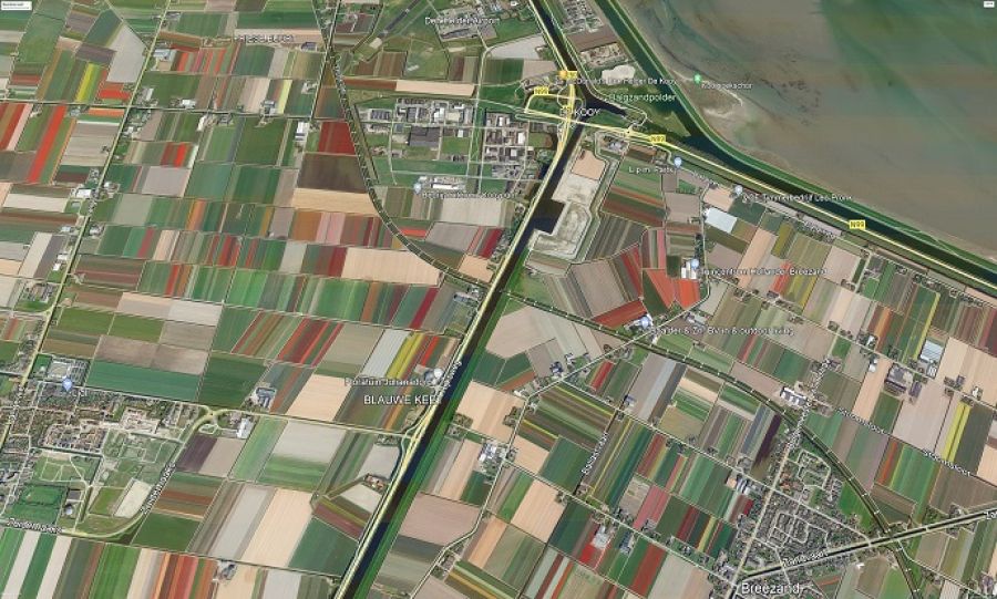 Wanneer u toch een keer naar Den Helder wilt afreizen, doe dat dan tussen eind maart en half mei. Dan staan de tulpen in bloei in wat wel aangeprezen wordt als het grootste aaneengesloten bollengebied ter wereld. De lichte zandgronden in deze regio zijn namelijk goed geschikt voor de bollenteelt. Een Google Earth opname van de maand april geeft een kleurrijk beeld van de kop van Noord-Holland (4). Er zijn verscheidene fiets- en wandeltochten uitgezet door dit bollengebied, onder andere vanaf station Anna Paulowna (zie: Wandelroute Anna Paulowna: kilometerslange bloemenzee - Toeractief ) In andere jaargetijden zul je het moeten doen met veel kale grond. Toch is het de moeite waard om eens uit het raam te kijken naar de molens en stolpboerderijen.