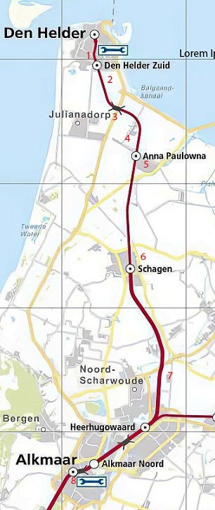 42,1: Station Alkmaar: het oorspronkelijke station, een waterstaatstation van de derde klas van 1865 staat er nog, maar heeft na de vele aanpassingen geen monumentale status verkregen.  Alkmaar was heel blij met de spoorverbinding naar Den Helder. Toen later ook de lijnen naar Haarlem, Amsterdam en Hoorn werden aangelegd, benoemde de stad zichzelf trots als draaischijf in het Noord-Hollands spoorwegnet. Met het passagiersvervoer ging het goed, maar het goederenvervoer bleef achter. Er was toch nog concurrentie van het Noord-Hollanskanaal. De exploitant was dan ook blij als het kanaal bevroren was.