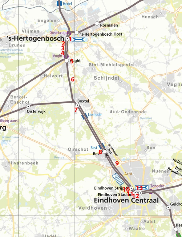 Bij station Best gaan we een bijna 2 kilometer lange tunnel in. Deze is in 2002 aangelegd om enkele drukke overwegen te vermijden. De aanleg heeft ook te maken met het plan om het hele tracé tussen Amsterdam en Eindhoven (en in een verre toekomst nog verder naar Aken) geschikt te maken voor treinsnelheden tot 200 km per uur. En daar horen geen overwegen bij.