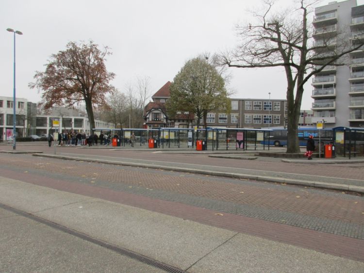 Het is een trage tocht met landbouwvoertuigen en verkeersdrempels, maar in bochten en bij zijwegen laten de boeren de bus netjes passeren. Zweeloo-busstation is een zogenaamde hub, een overstapstation. Een grote groep scholieren stapt in, allemaal jongens. Van Zweeloo tot Emmen gaat het vlot, want dan voert de route over de autoweg waar 100 km/h is toegestaan. Een wisselend landschap van weiden en houtwallen en het nevelige weer versterken het besef dat het een mooie herfstdag is. Het gaat iets heuvelen, ja dit is de Hondsrug. Wanneer het eerst gebouw in Emmen in zicht komt, de Kinepolis, rijden we hartje Emmen binnen. Dat vind ik altijd het bijzondere aan Emmen, niks buitenwijken aan de westkant, je bent plompverloren meteen in het centrum. En dat voor een stad die qua oppervlakte de vierde gemeente in Nederland is en met 107.000 inwoners de grootste in Drenthe. Maar geen grootsteedse allures, op een paar hoge woontorens na. Emmen is een stad van dorpen met flink veel groen. Op het station moet ik overstappen, een groot matrixbord geeft duidelijk voor de komende 20 minuten de buslijnen met de bijbehorende perrons aan. Het plein is groot, overzichtelijk en vrij leeg. Er is een klein treinstation, Emmen is tenslotte nog een kopstation en zo langzamerhand vanwege inwonertal en ligging wel rijp voor de nieuwe Nedersaksenlijn. Er is een Huiskamer voor versnaperingen en warmte, op een ijzeren bank in de hal ligt een man te slapen. Er is een wc die voor 50 cent met pinbetaling gebruikt kan worden. De klok is wat verdekt opgehangen in de stationshal, ook bij de andere stations die ik aan doe, is het zoeken naar een klok. Op het plein wemelt het van de beveiligers, handhavers en politie vanwege het AZC in Ter Apel. Bij alle busperrons zijn prullenbakken, zelfs met gescheiden vakken. Elke abri heeft 2 ijzeren bankjes voor 1 à 2 personen, dus niet al te veel zitruimte en ik moet 25 minuten wachten.